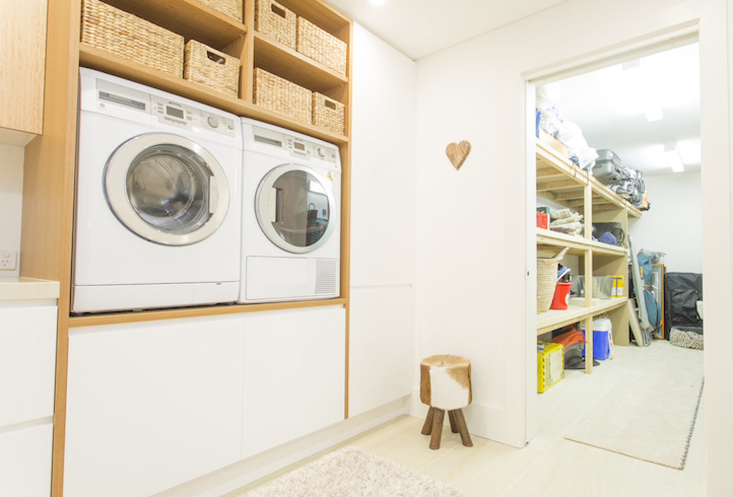 racks, sandstone tiles and a marble bench top. Open up the large cedar cellar doors to a double wine fridge and heaps of storage. As far as laundries