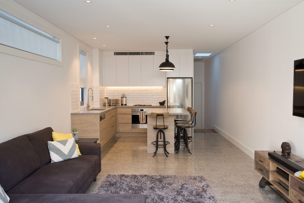 if you've been keeping up with our social media pages, you may be familiar with some of these photos but what you haven't seen is what it looked like before... Technically, we can't call it a 'new home' build, although we did completely strip the inside bare to the bone. The surrounding structure was there, we just needed to work with the clients to their living and design requirements in order to come up with the best outcome aligned with the budget. We love the result! Consistent design elements right through, we developed an awesome (nearly new) home, using the terrace layout to give it character that was contemporary, whilst incorporating original elements such as sandstone upon entry and splashed inside, as well as the original exposed brick in the staircase. These give hints to the history of the building, whilst sitting perfectly with the new decor. Check out the photos below for some before and afters, as well as our houzz and alts & adds #48 for more detail and description.