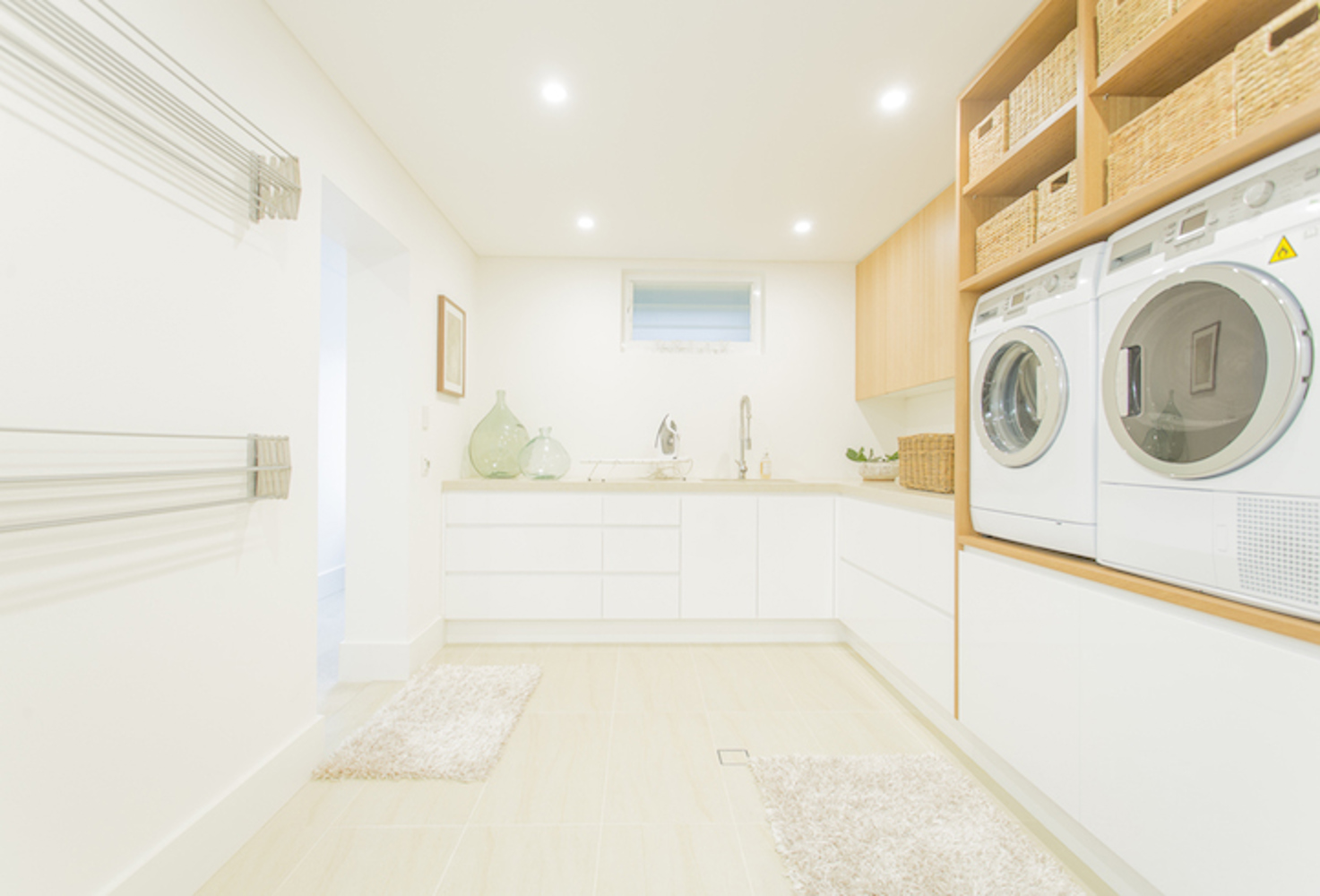 racks, sandstone tiles and a marble bench top. Open up the large cedar cellar doors to a double wine fridge and heaps of storage. As far as laundries