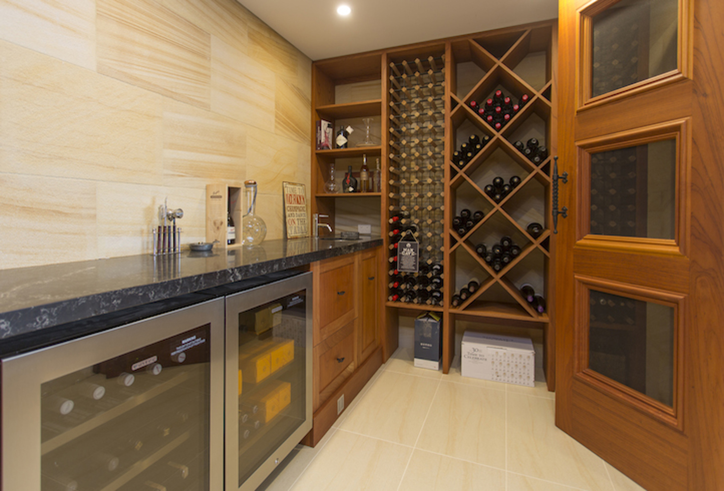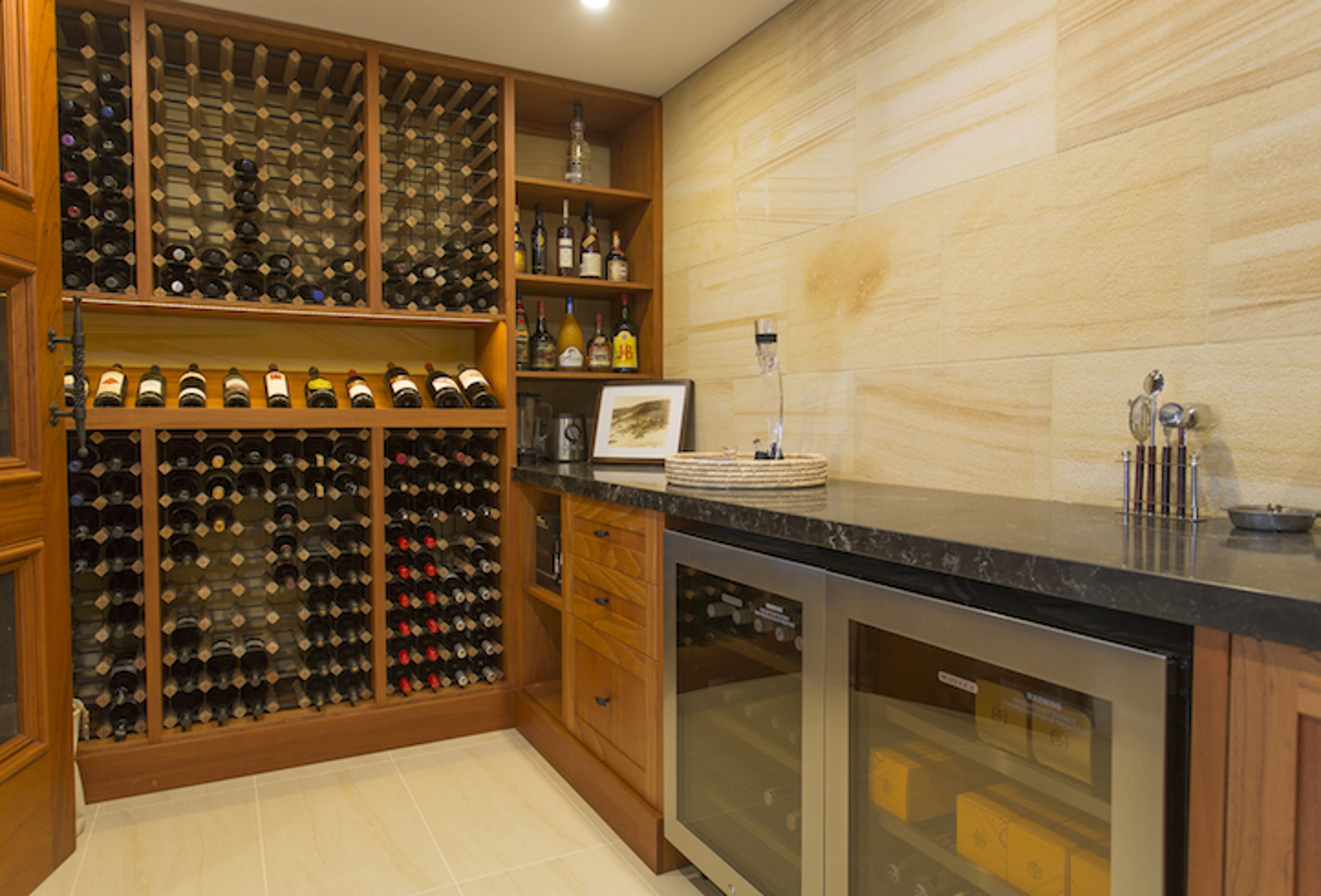 sandstone feature and white cabinetry, all situated by the pool (not pictured). The cellar is beautifully custom designed using cedar timber wine
