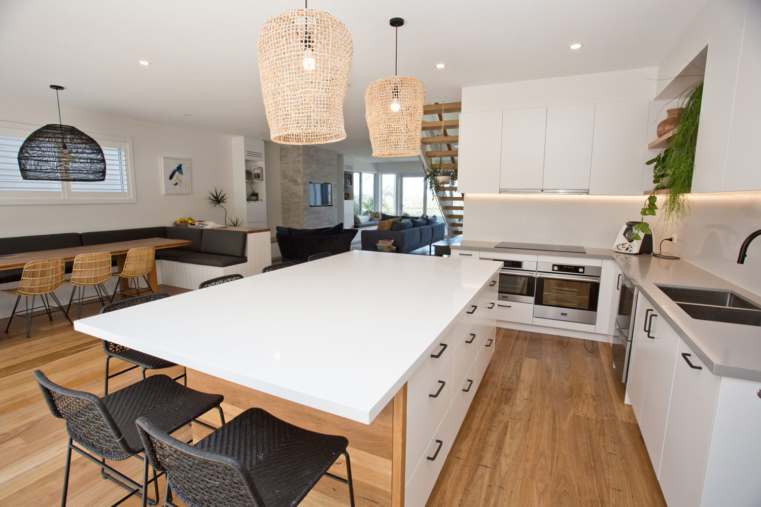 featuring a large island bench, is both stylish and practical with ample storage space, white cabinetry and gorgeous timber flooring. This opens